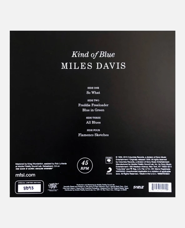 Sortie : 1959 | Durée d’écoute : 45 min. | Label : Sony | Titres : So What, Freddie Freeloader, Blue In Green, All Blues, Flamenco Sketches | Vinyle Bleu