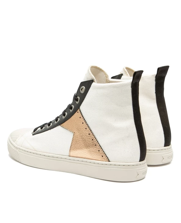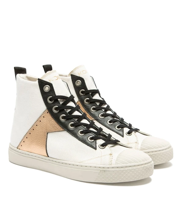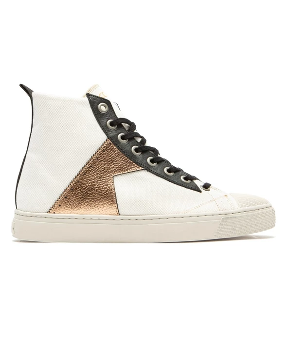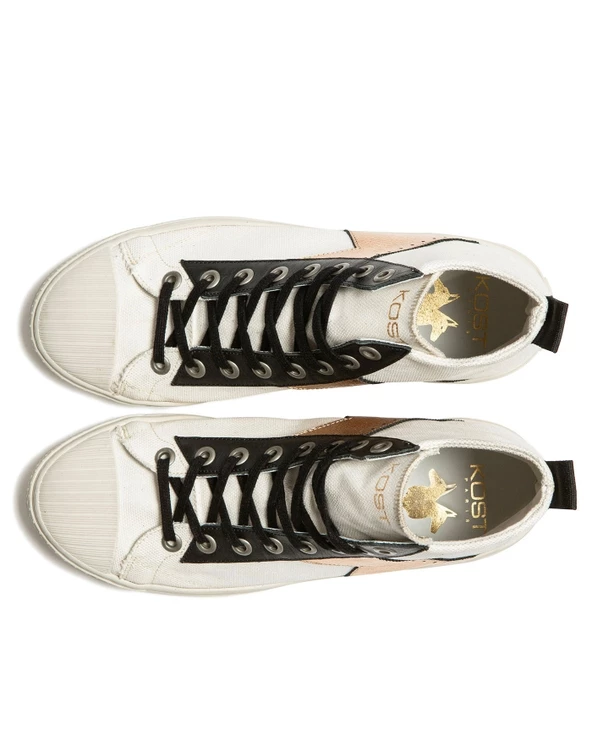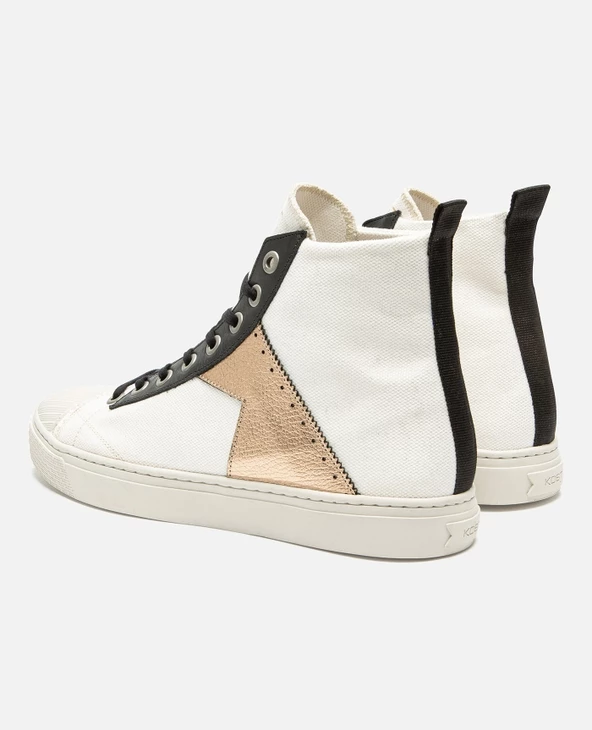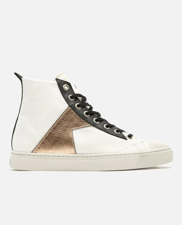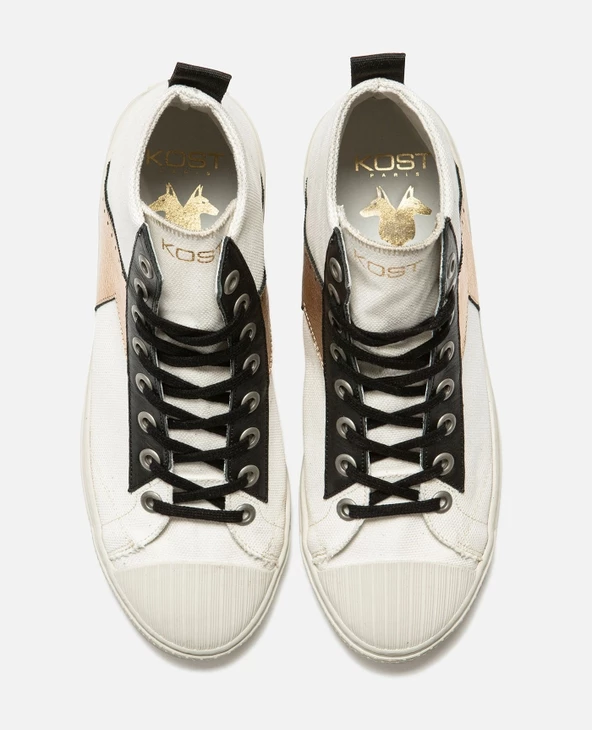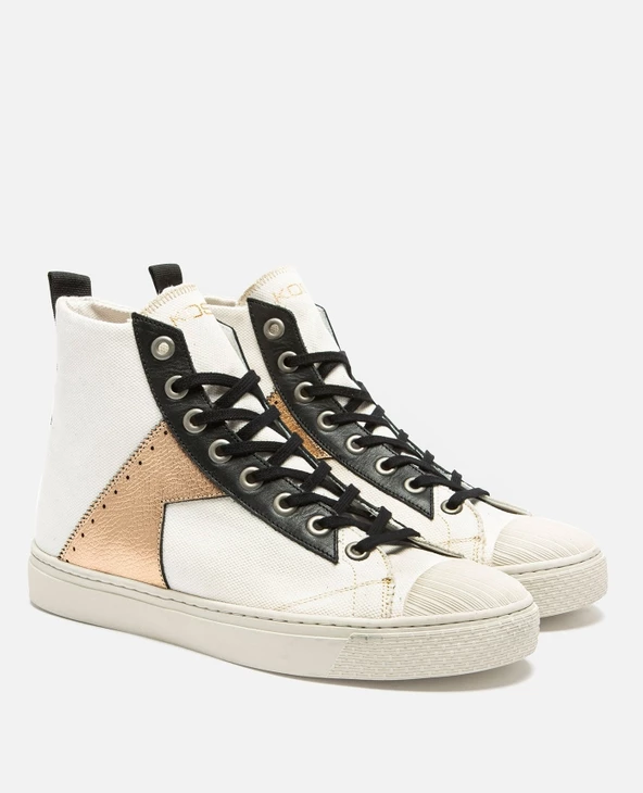 Ces baskets montantes en cuir tannage végétal sont montées sur une semelle en caoutchouc recyclé (20%). Pour une plus grande solidité, on a misé sur un cousu Strobel pour qu’elle puisse durer plusieurs saisons.