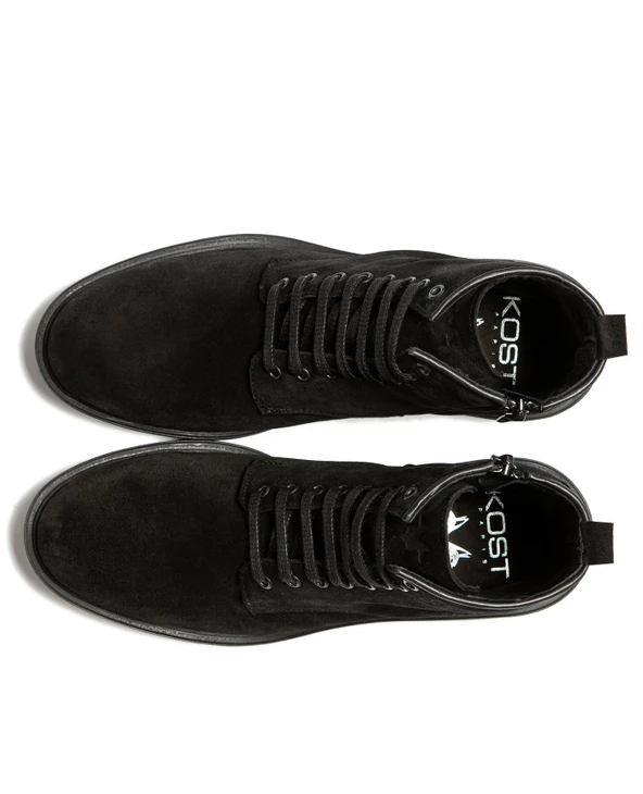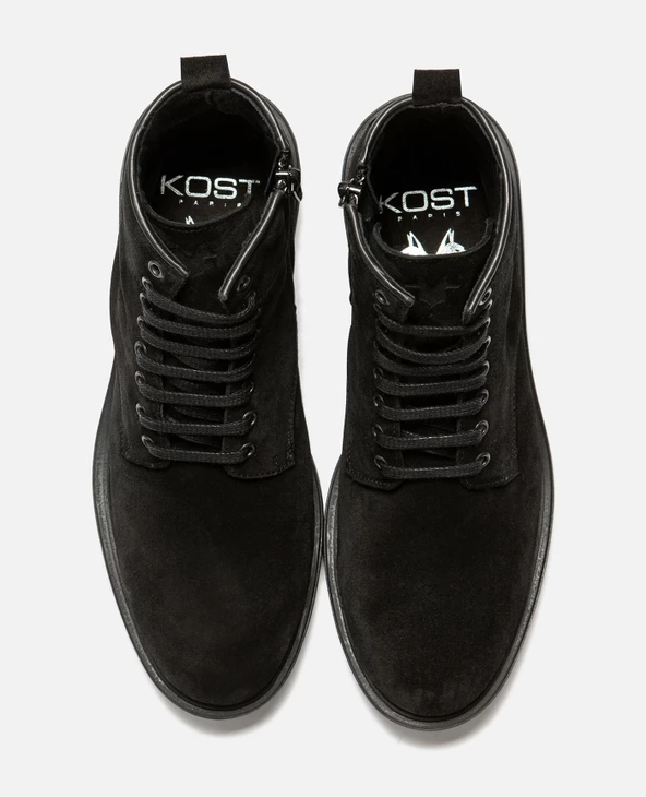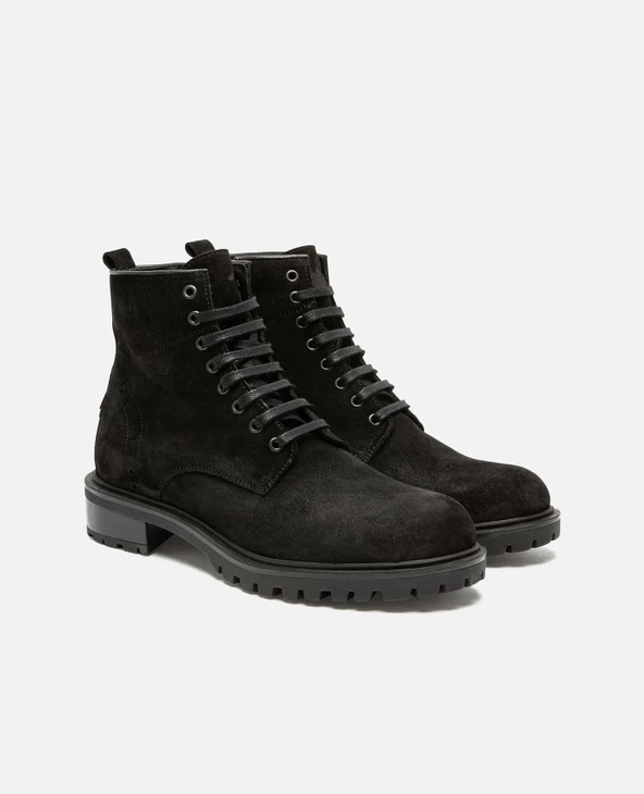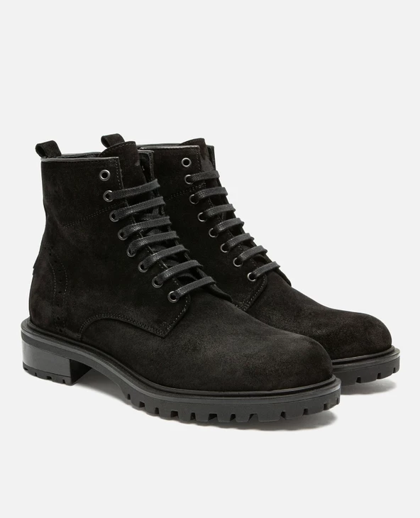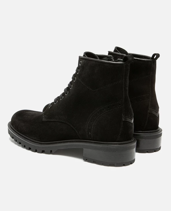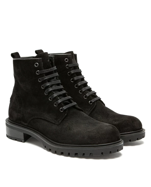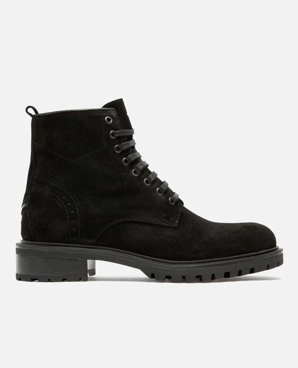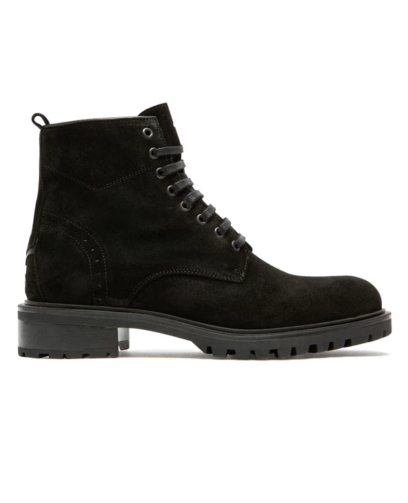 Cette bottine à lacets pour femme s’habille d’un cuir croûte velours certifiée Leather Working Group et montée sur une semelle crantée. Également disponible en cuir et cuir verni noir.