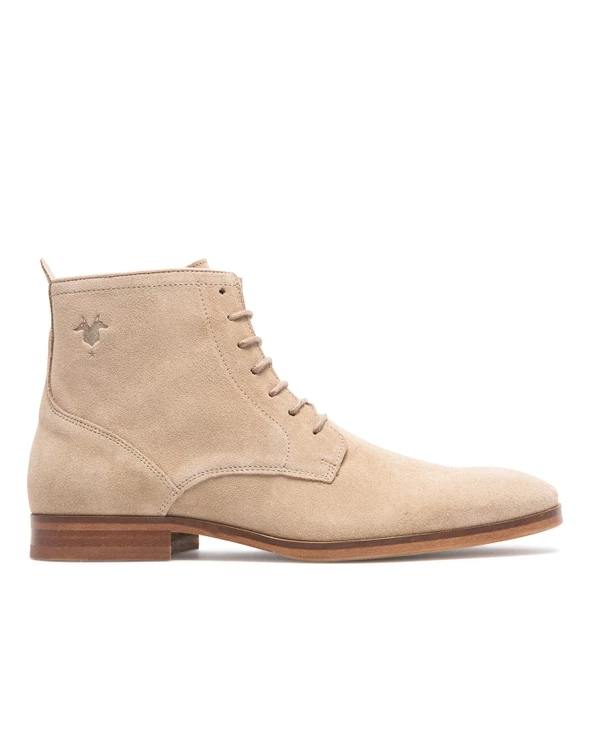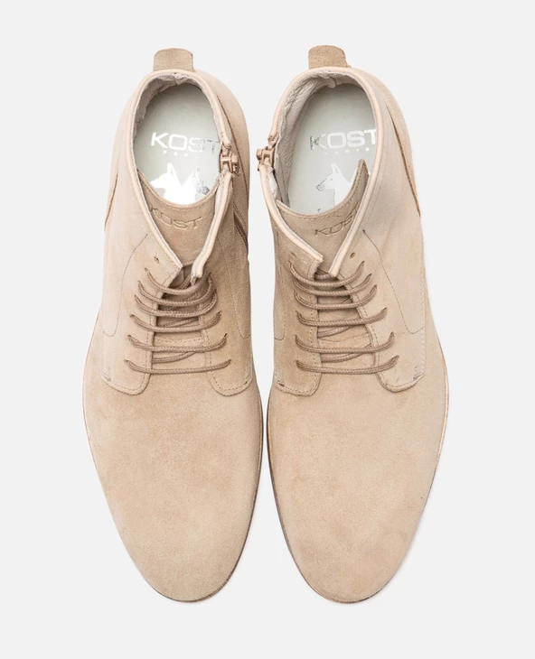 Une bottine à lacets en croûte velours beige aux découpes épurées. Elle est dotée d’une semelle en gomme pour l’inspiration outdoor chic. Montée en cousu Blake permettant de rendre la chaussure solide et légère.