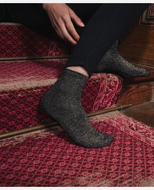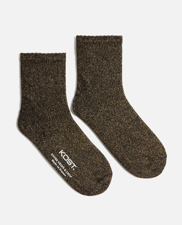 Chaussettes fabriquées en France en jersey coton et lurex, bord feston. Composition : 42% Polyamide – 37% Coton – 18% Polyester métallisé – 3% Elasthane. Taille unique (36-40)