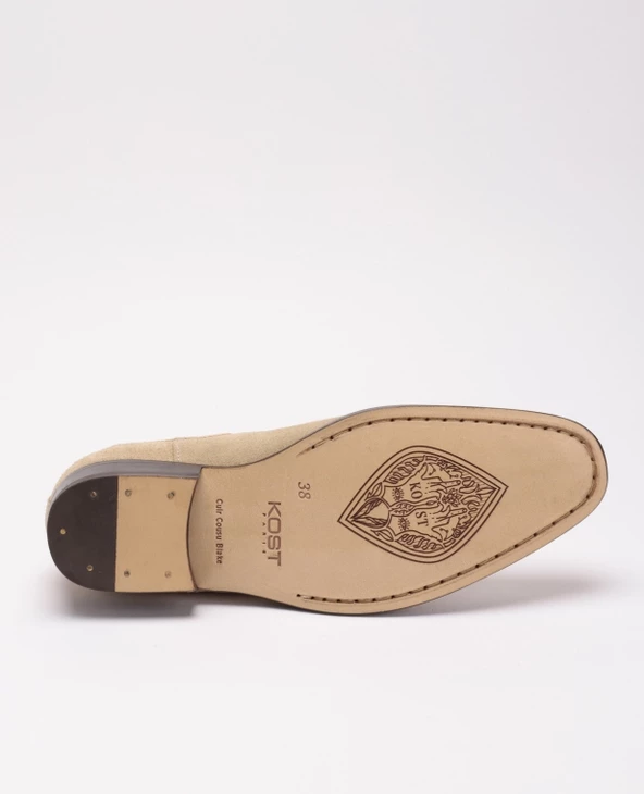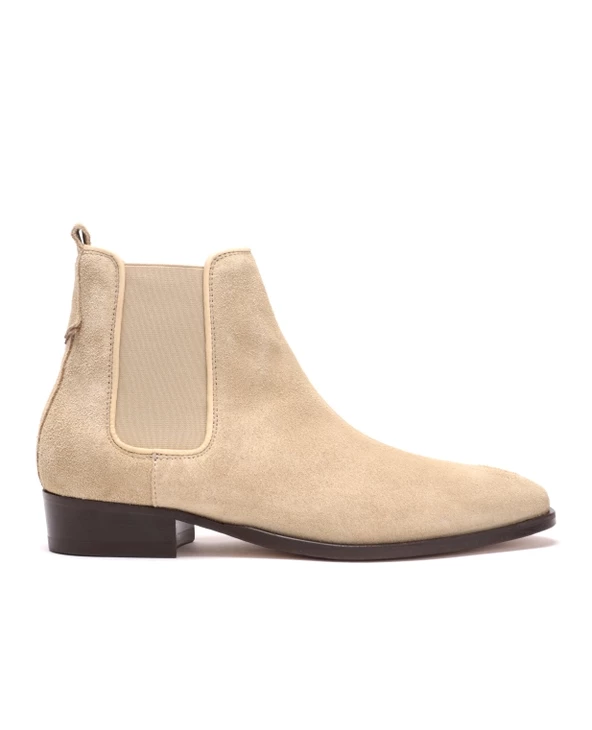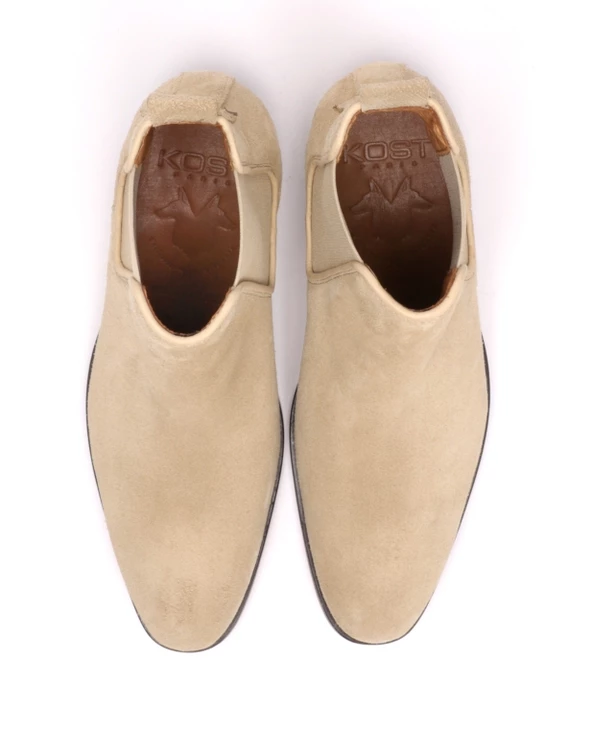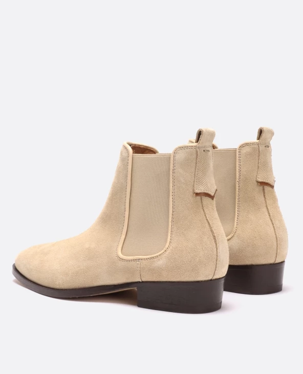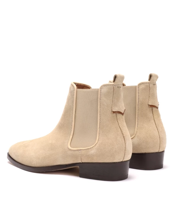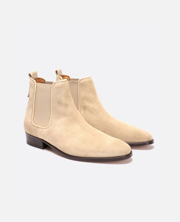 NANCY est une chelsea boots en croûte velours beige montée sur une semelle en cuir. Elle est dotée d’un élastique au niveau de la cheville permettant de l’enfiler et la retirer facilement et repose sur un petit talon élégant.