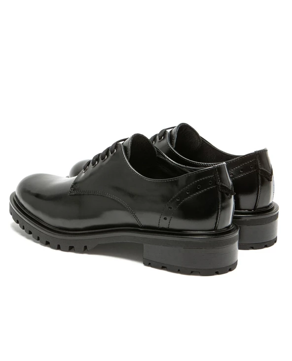 Surélevée sur une semelle crantée, nos derbies en cuir noir verni revendique un look chic, rock et urbain.