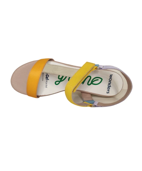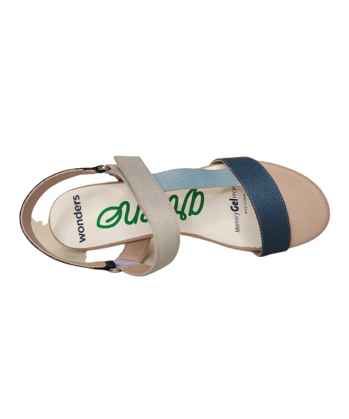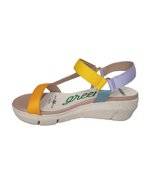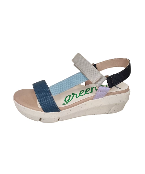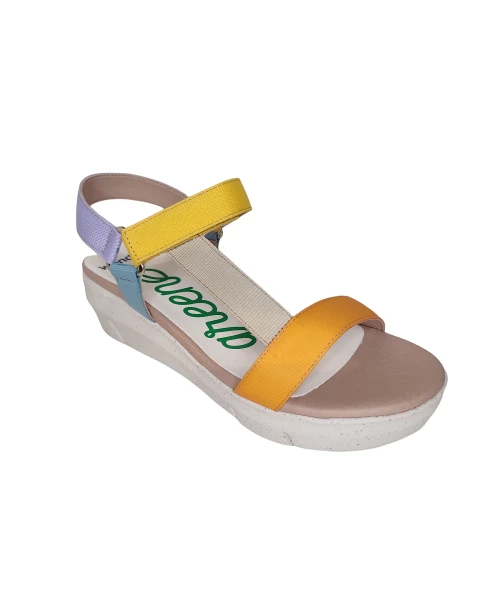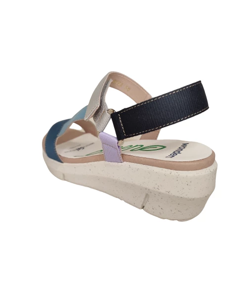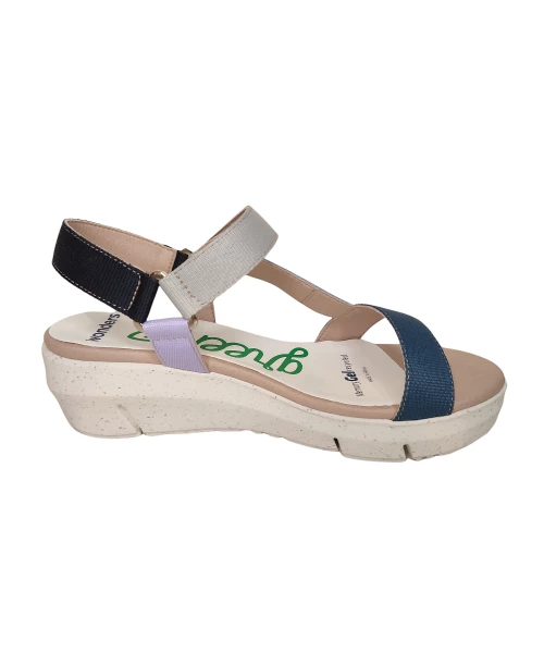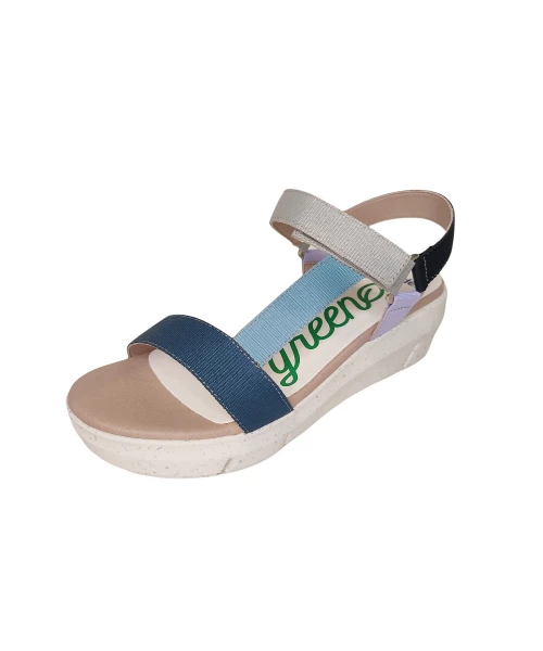 Sandale compensée composée de bandes de nylon de différentes couleurs. Fermeture velcro avec sangle réglable.